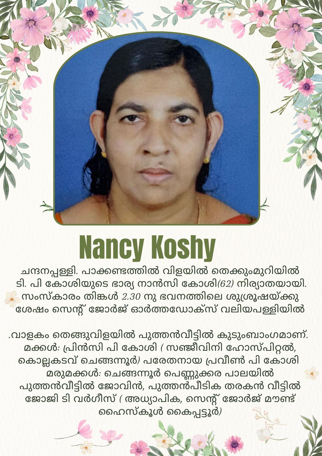 12:00 pm - 5:00 pm Funeral Service of Nancy Koshy February 2 @ 12:00 pm - 5:00 pm Funeral Service of Nancy Koshy